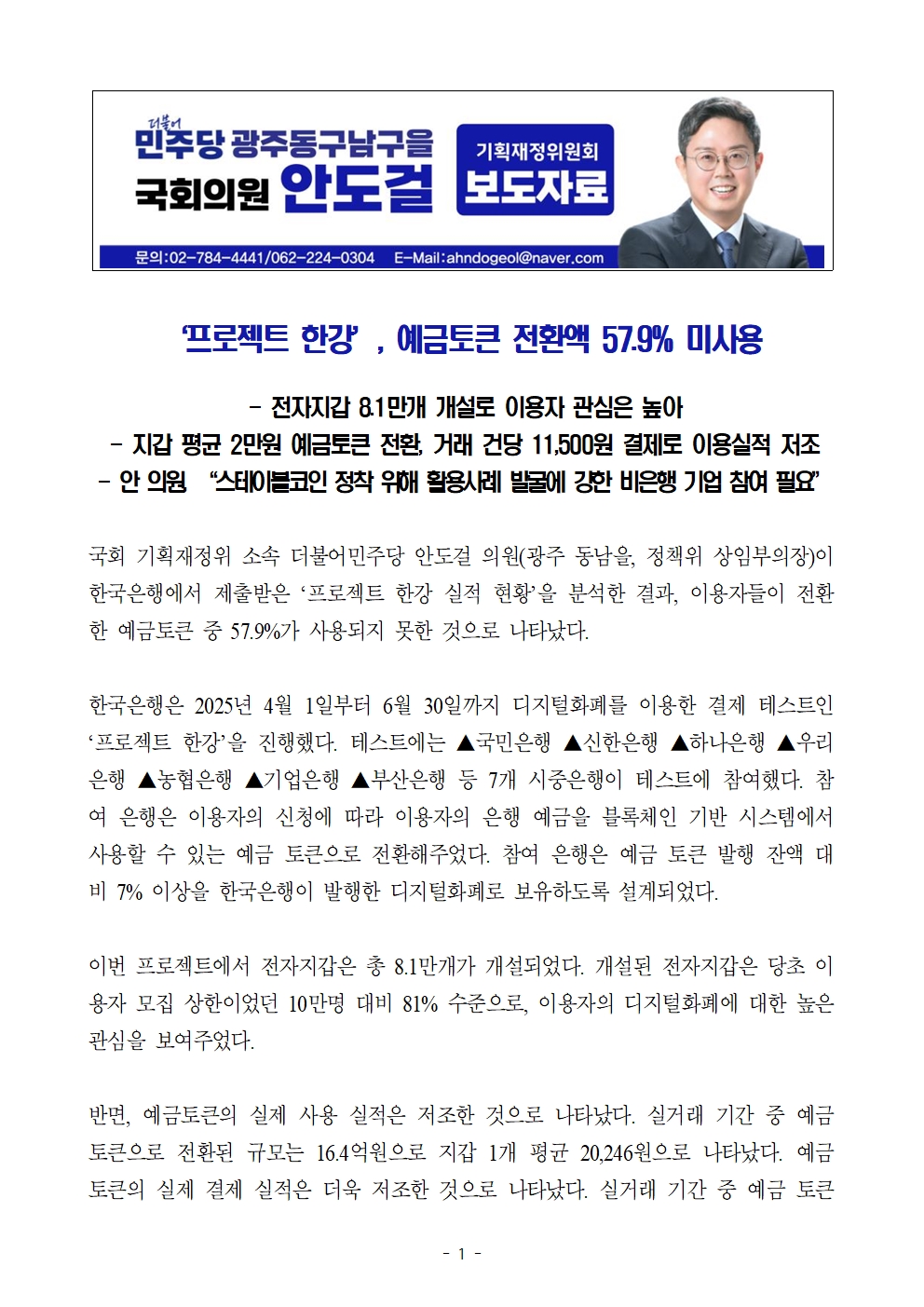 [국회의원 안도걸 보도자료] 프로젝트 한강’, 예금토큰 전환액 57.9% 미사용