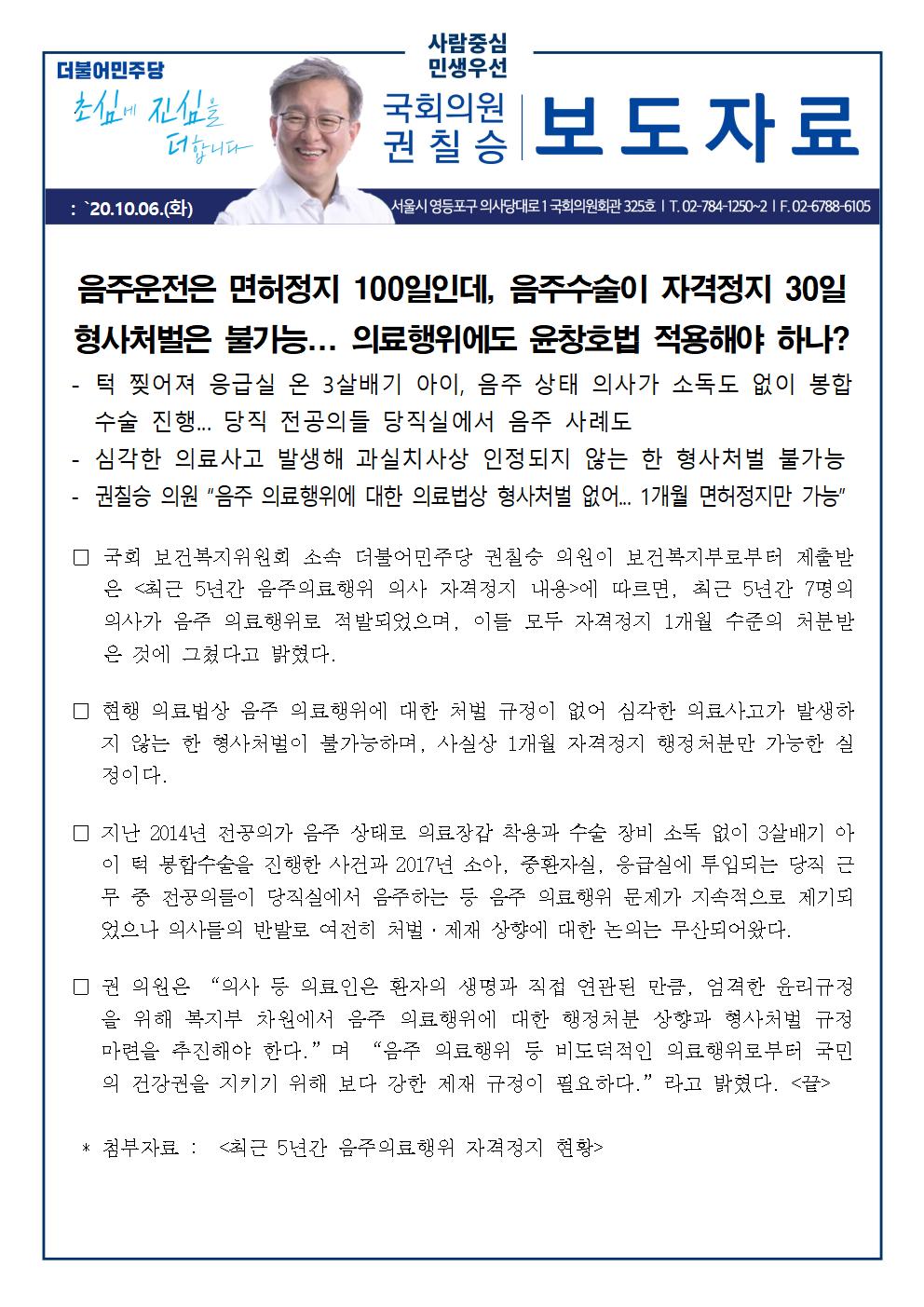 [권칠승 의원] 20.10.06. 음주운전은 면허정지 100일인데, 음주수술이 자격정지 30일 형사처벌은 불가능... 의료행위에도 윤창호법 적용해야 하나?