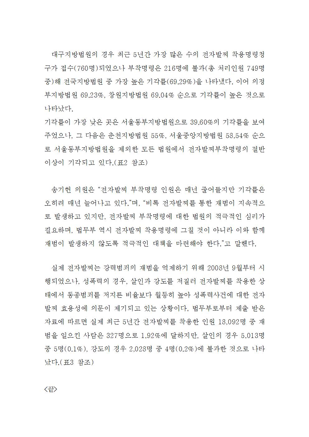 [송기헌 의원실 국정감사 보도자료] - 전자발찌 효용성 논란 와중에 기각률도 높아 (2020.09.30)