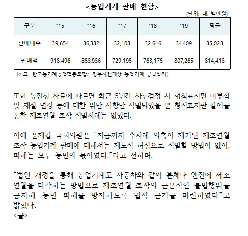 [국회의원 윤재갑] 농업기계 제조연월 조작, 피해는 고스란히 농민 몫