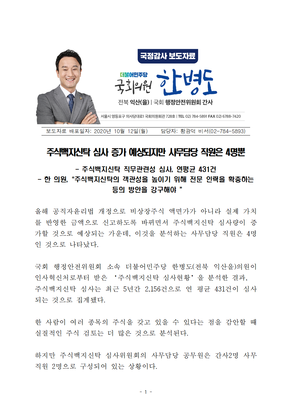 [국회의원 한병도] 20.10.12 주식백지신탁 심사 증가 예상되지만 사무담당 직원은 4명뿐