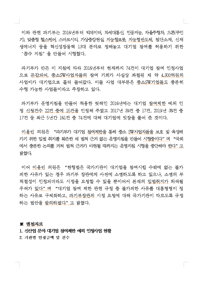 [이용빈 국회의원] 과기부, 대기업에 빗장 푼 SW 운영지침 만들어 입법 취지 ‘훼손’_20201004