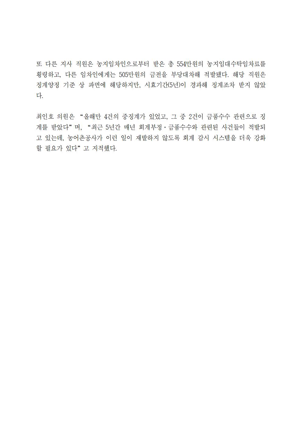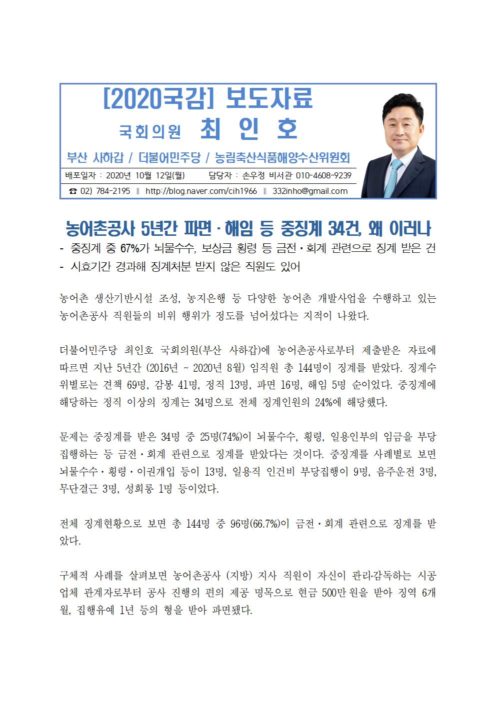 [국회의원 최인호] 농어촌공사 5년간 파면·해임 등 중징계 34건, 왜이러나