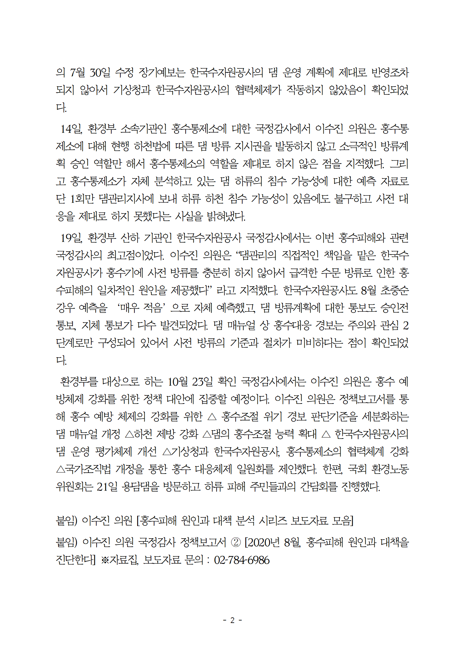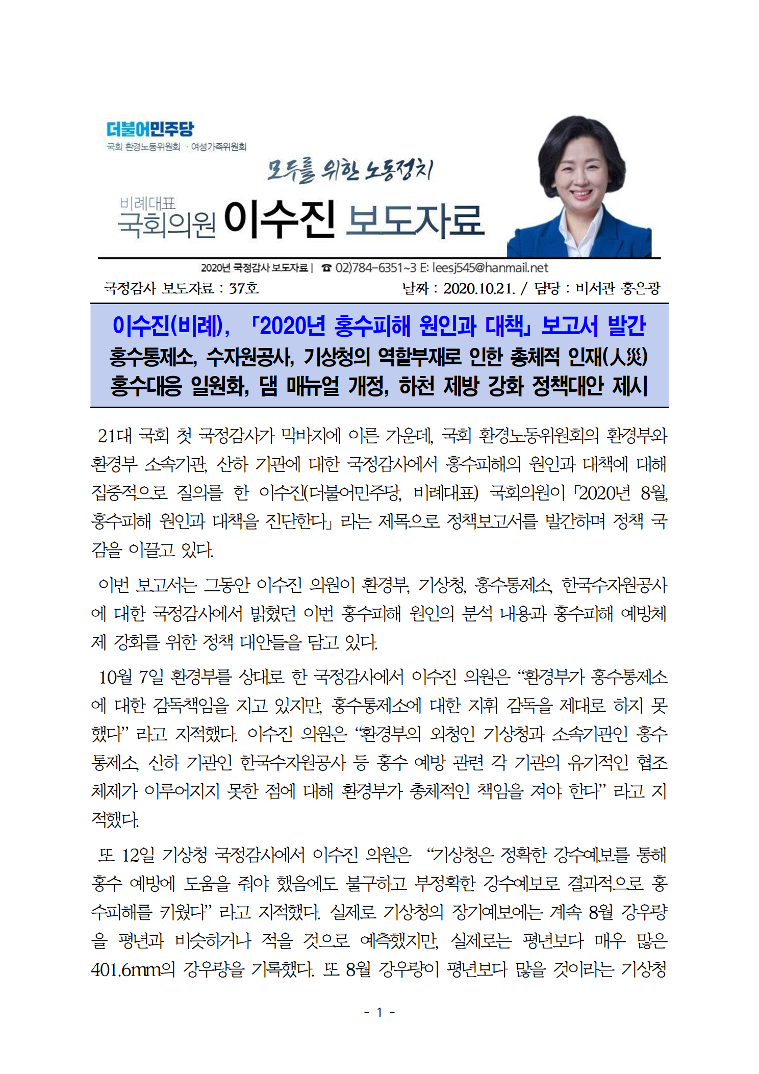 [이수진 의원] 이수진(비례), 「2020년 홍수피해 원인과 대책」보고서 발간