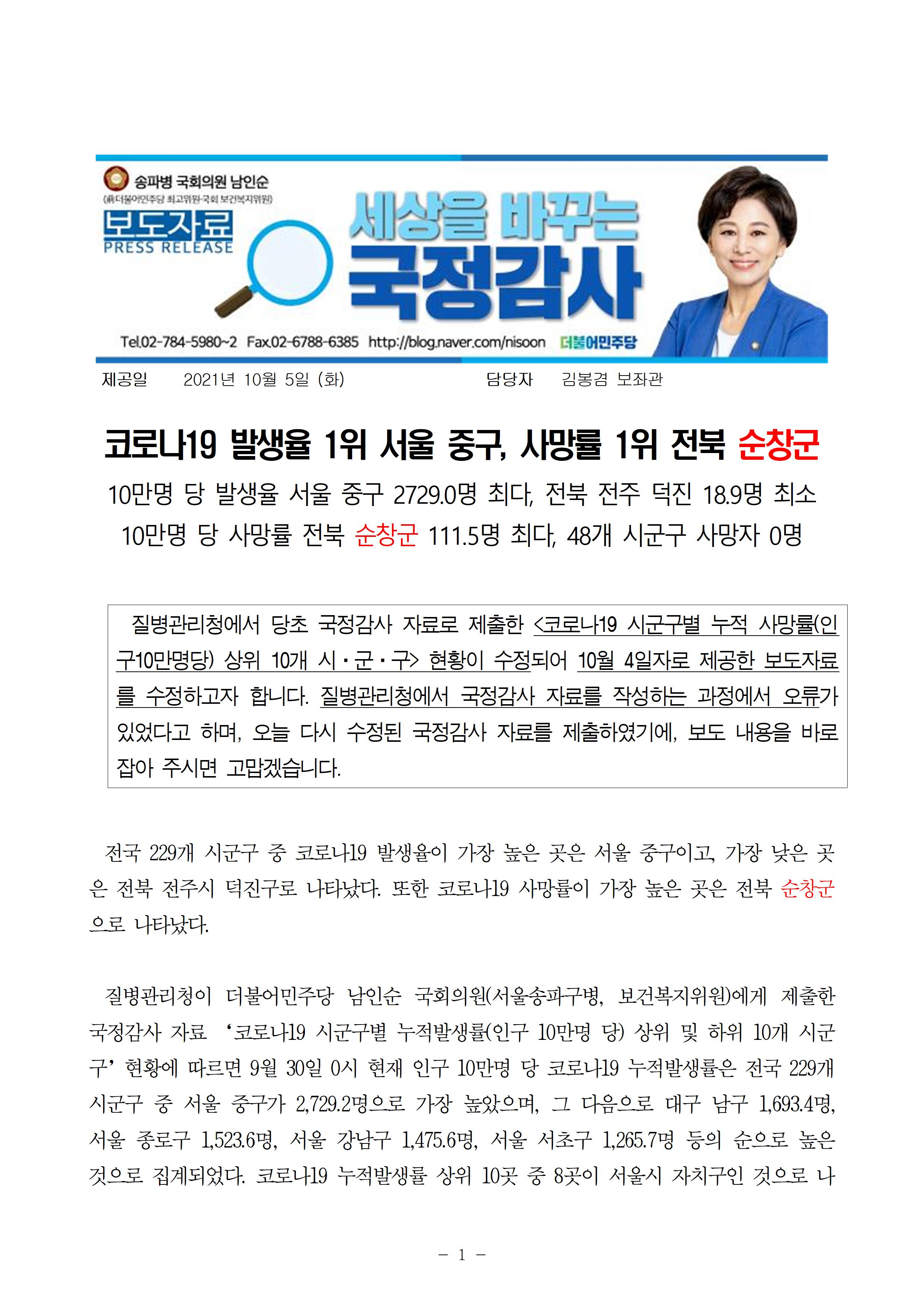 [국회의원 남인순] 코로나19 발생율 1위 서울 중구, 사망률 1위 전북 순창군
