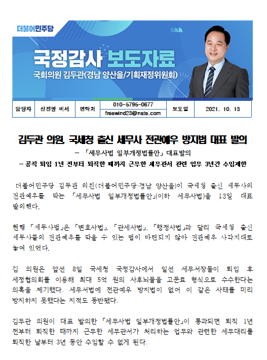 김두관의원실_국정감사_보도자료_김두관_의원,_국세청_출신_세무사_전관예우_방지법_대표_발의.hwp