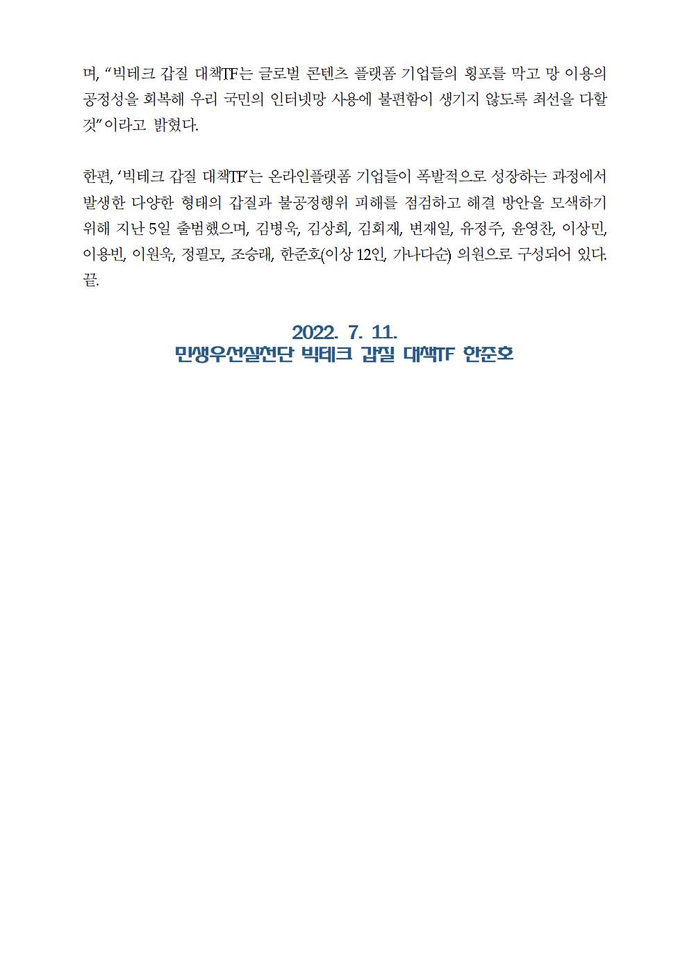 [보도자료] 더불어민주당 민생우선실천단, 빅테크 갑질 대책TF, 12일 KT 목동 데이터센터 방문