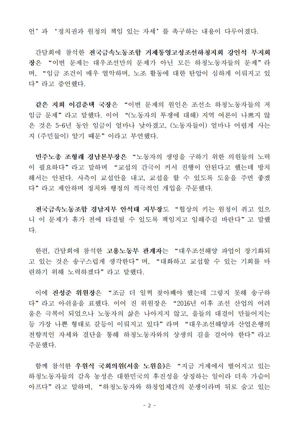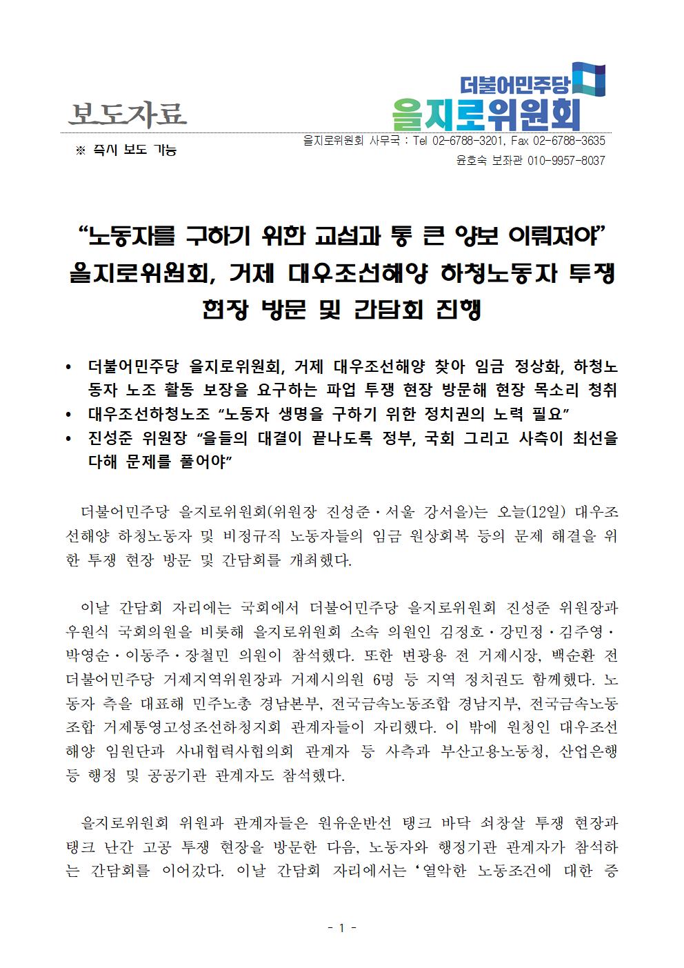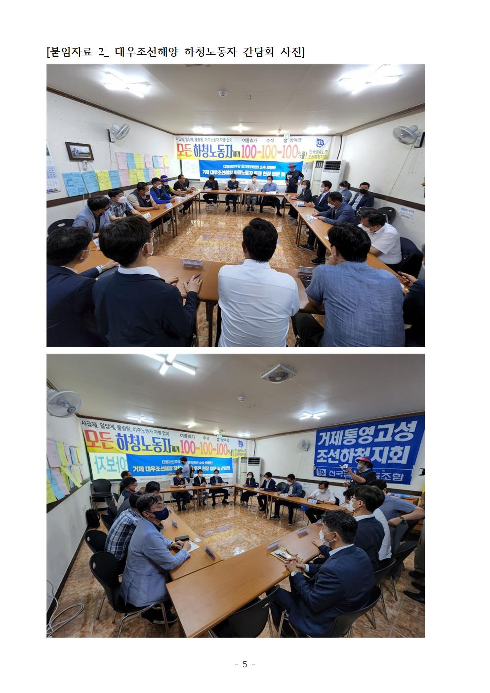 [보도자료] 더불어민주당 을지로위원회, 거제 대우조선해양 하청노동자 투쟁 현장 방문 및 간담회 진행