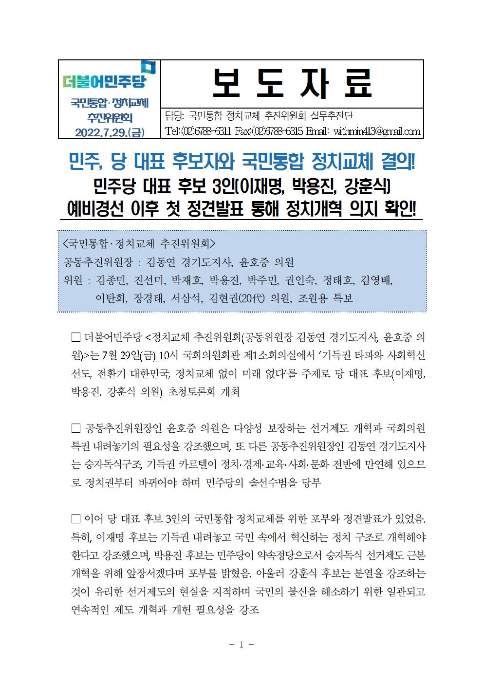 [보도자료] 국민통합 정치교체 추진위원회 당대표 후보자 국민통합 정치교체 결의