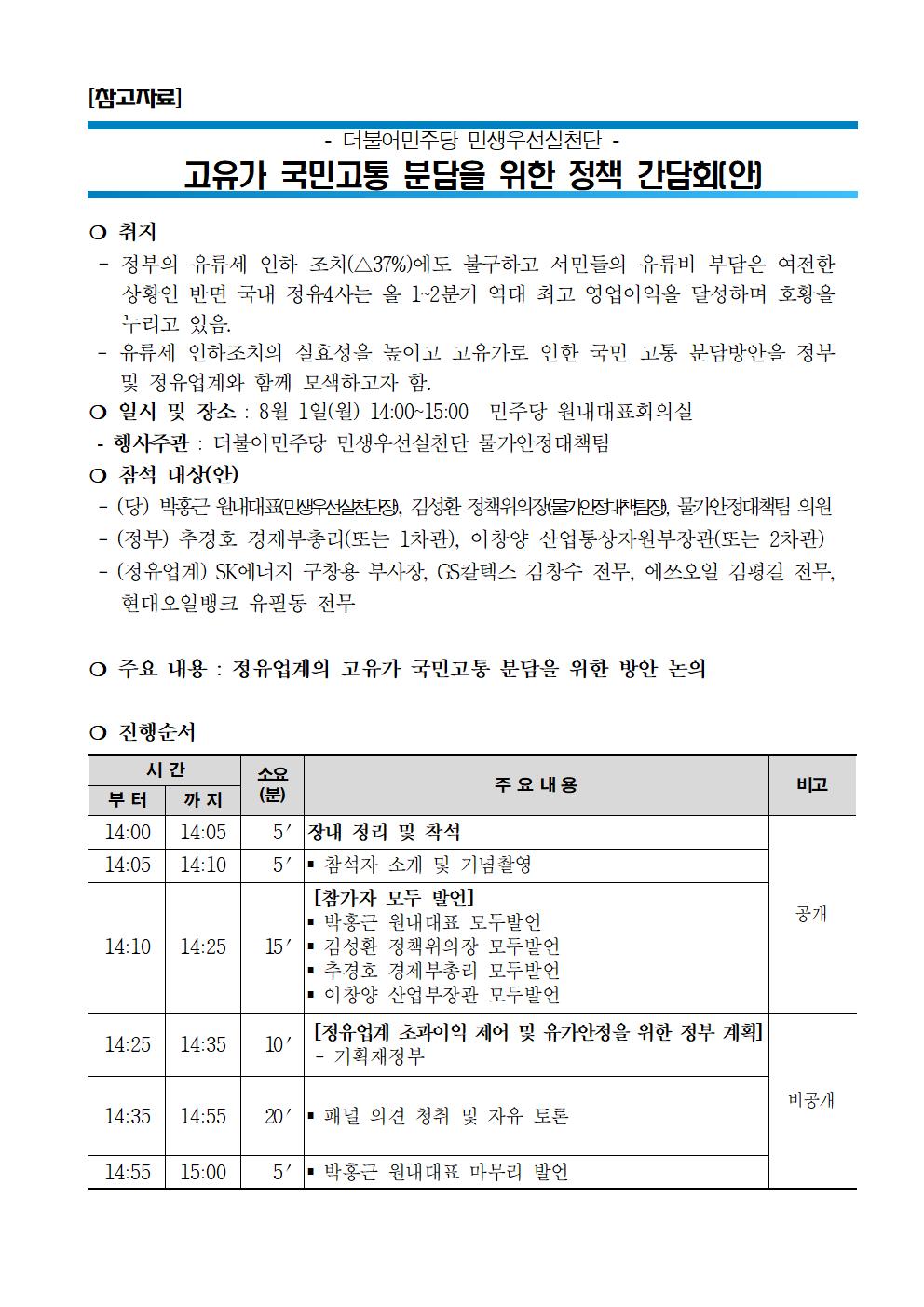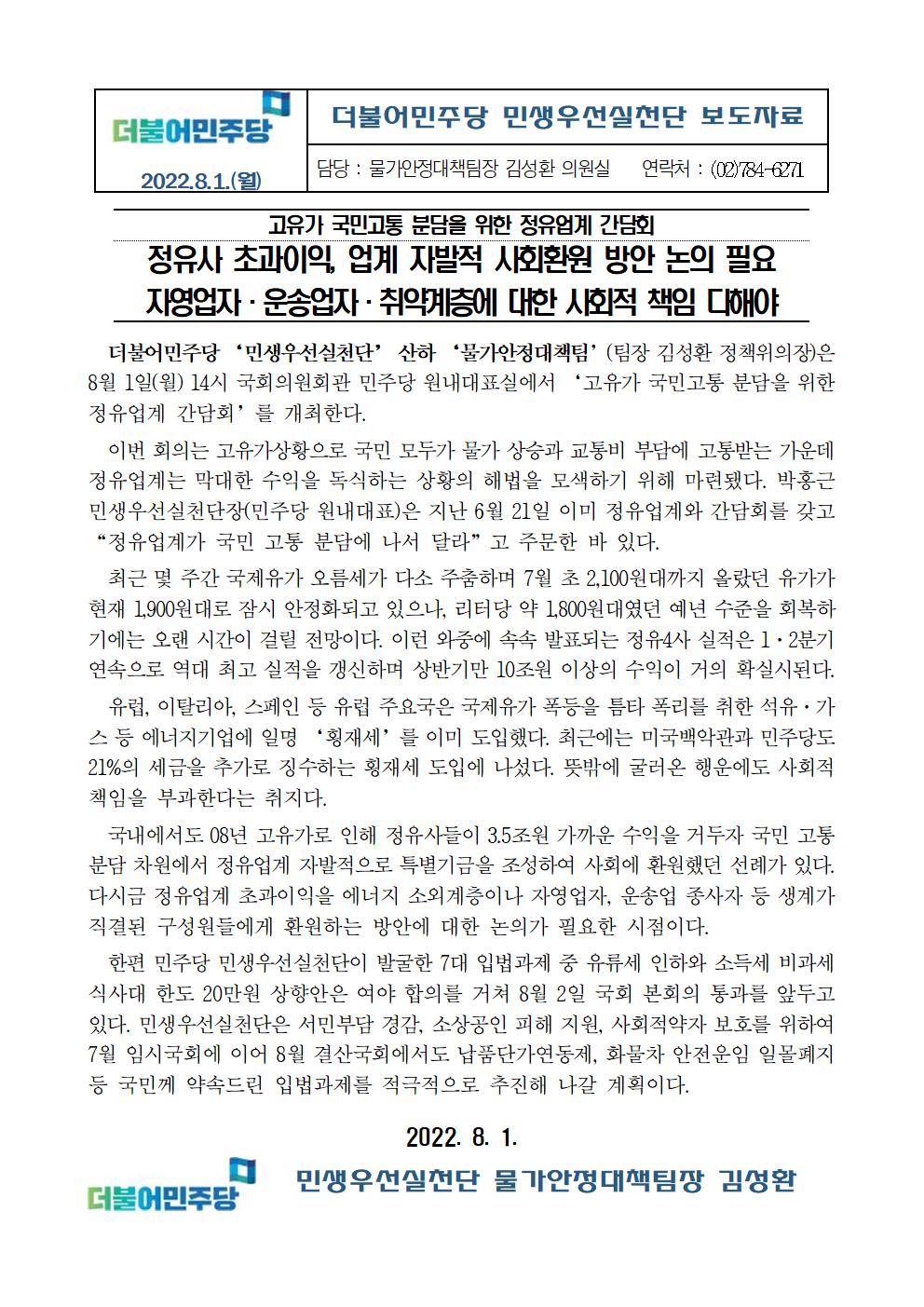 [보도자료] 더불어민주당 민생우선실천단, 고유가 국민고통 분담을 위한 정유업계 간담회 개최