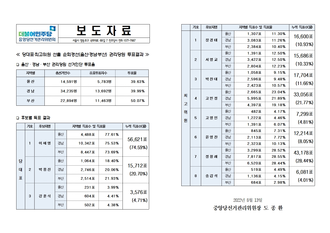 [보도자료] 당대표‧최고위원 선출 순회경선(울산‧경남‧부산) 권리당원 투표결과