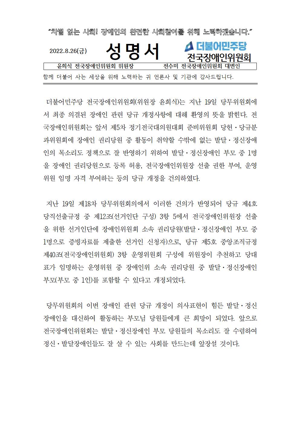 [성명서] 더불어민주당 전국장애인위원회, 장애인 관련 당규 개정사항 관련