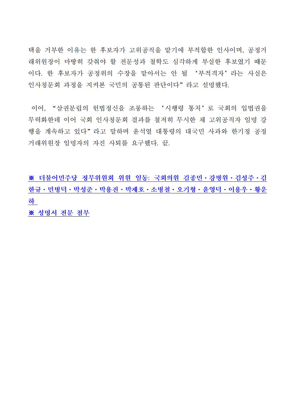 [보도자료 및 성명서] 민주당 정무위원 일동, 윤석열 대통령의 한기정 공정거래위원장 후보자 임명 강행 강력 규탄!