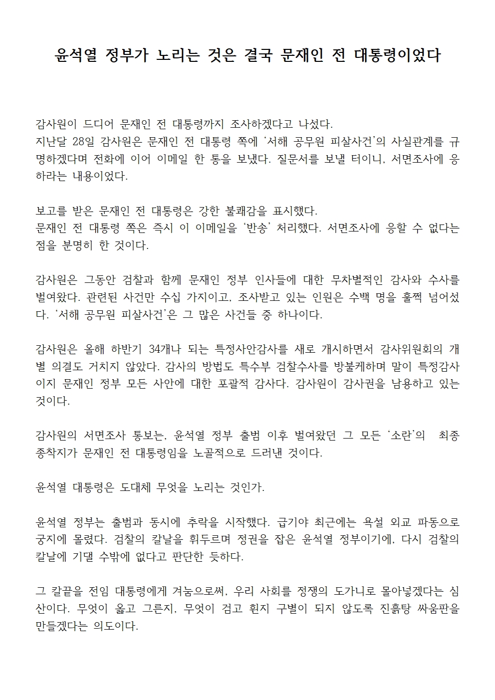 [기자회견문] 더불어민주당 윤석열정권 정치탄압대책위원회, 윤석열 정부가 노리는 것은 결국 문재인 전 대통령이었다