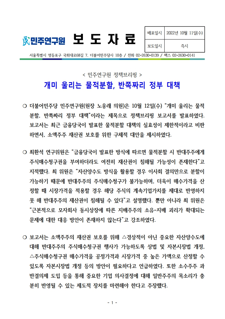 [정책브리핑 및 보도자료] 더불어민주당 민주연구원, 개미 울리는 물적 분할, 반쪽자리 정부 대책