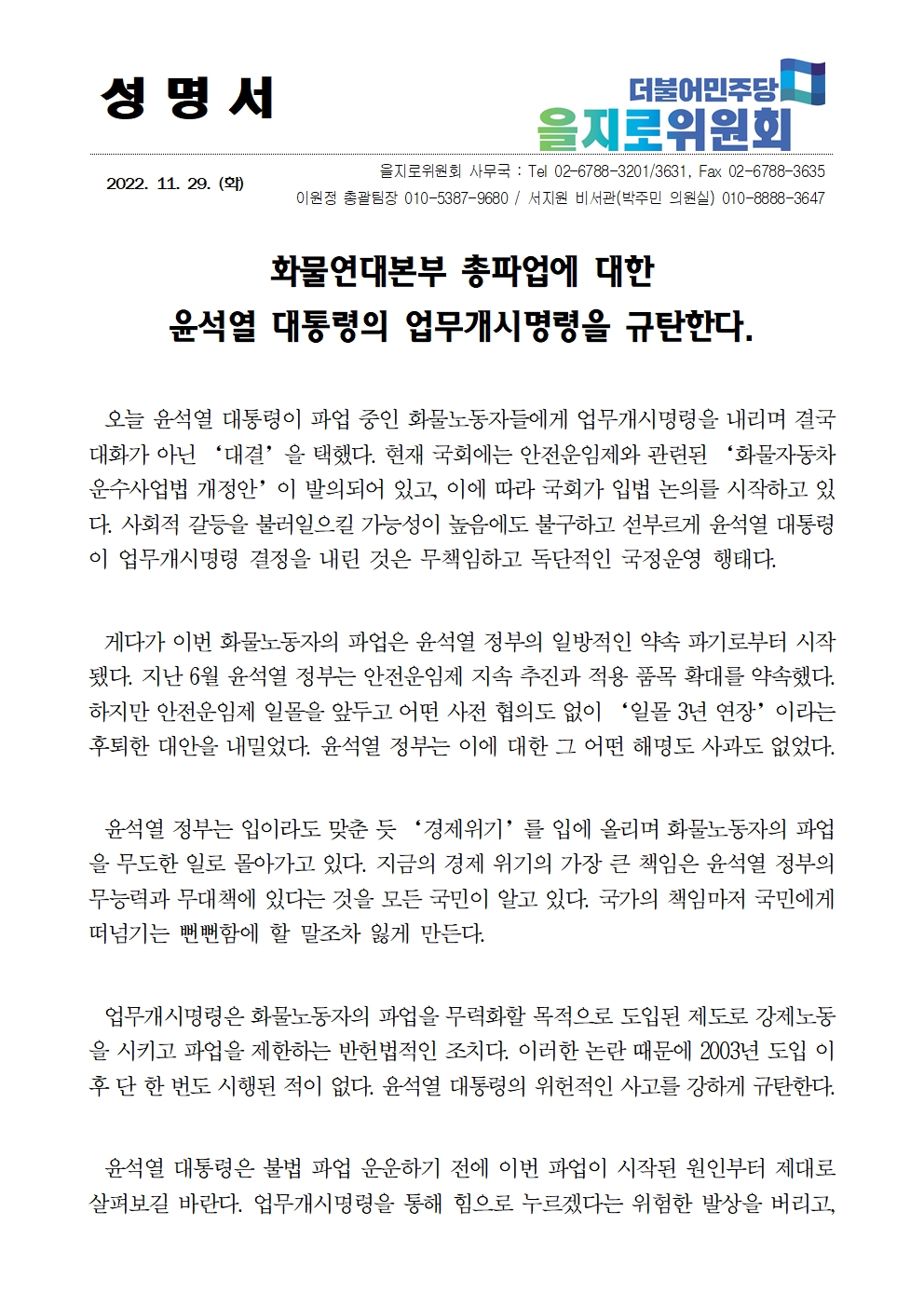 [성명서] 더불어민주당 을지키는민생실천위원회, 화물연대본부 총파업에 대한 윤석열 대통령의 업무개시명령을 규탄한다