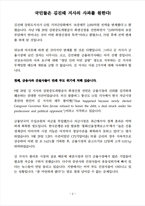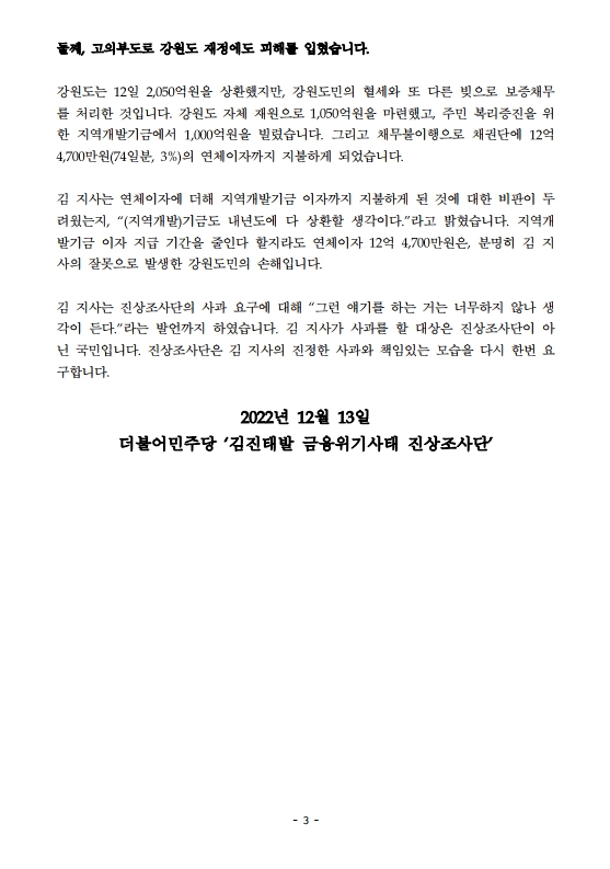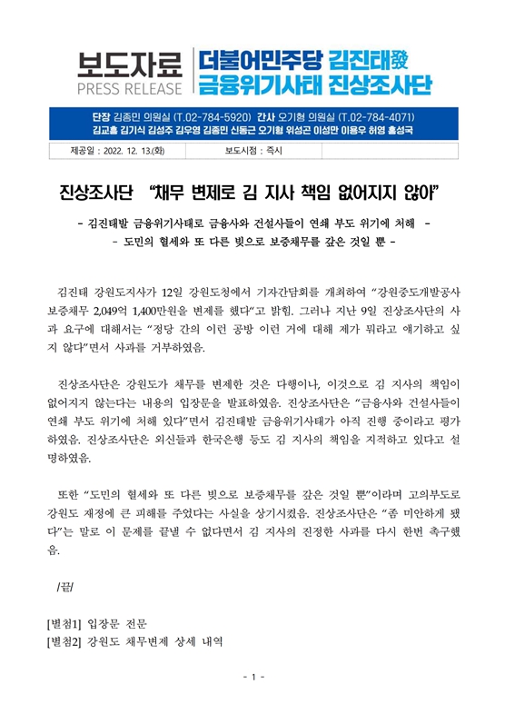 [보도자료] 더불어민주당 ‘김진태발 금융위기사태 진상조사단’, 강원도 보증 채무 변제 관련 입장