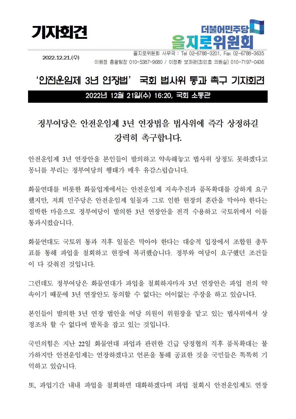 [기자회견문] 더불어민주당 을지로위원회, 정부여당은 안전운임제 3년 연장법을 법사위에 즉각 상정하길 강력히 촉구합니다