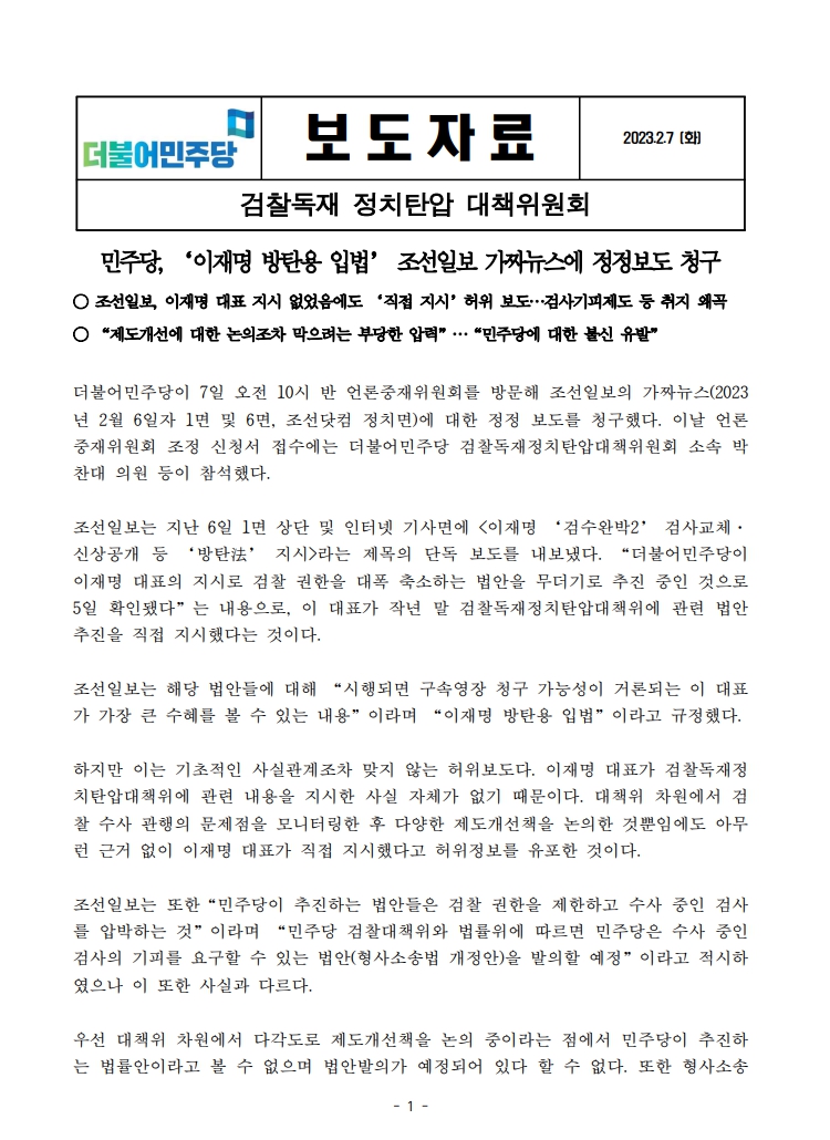 [보도자료] 더불어민주당 검찰독재정치탄압대책위원회, '이재명 방탄용 입법' 조선일보 가짜뉴스에 정정보도 청구