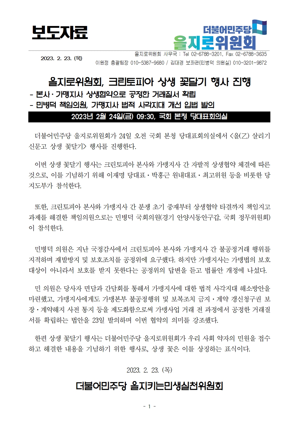 [보도자료] 더불어민주당 을지로위원회, 크린토피아 상생 꽃달기 행사 진행
