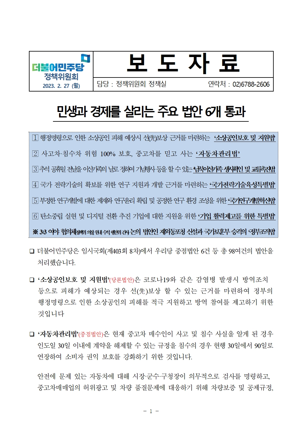 [보도자료] 더불어민주당 정책위원회, 민생과 경제를 살리는 주요 법안 6개 통과