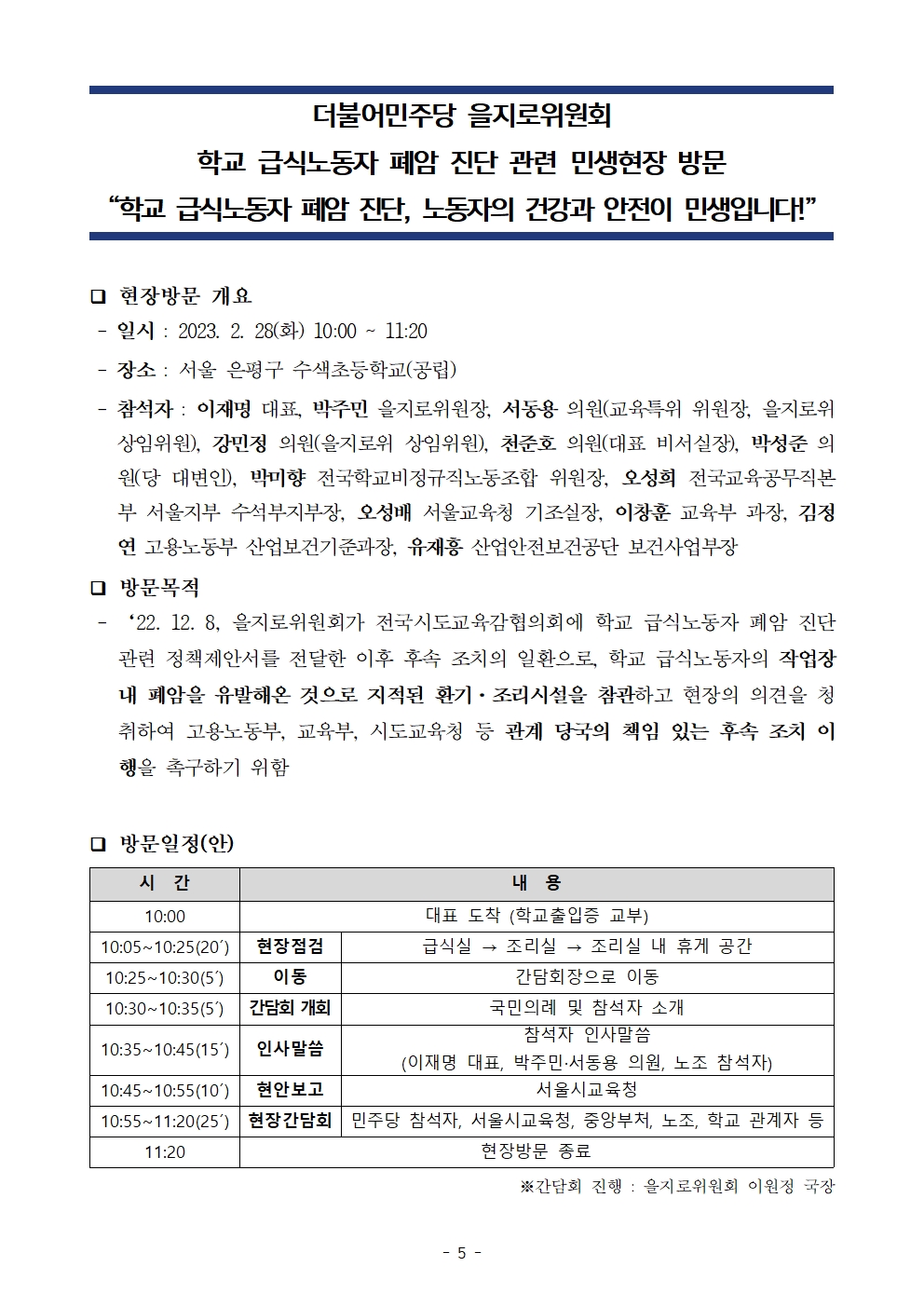 [보도자료] 더불어민주당 을지로위원회, 학교 급식노동자 폐암진단 관련 민생현장 방문