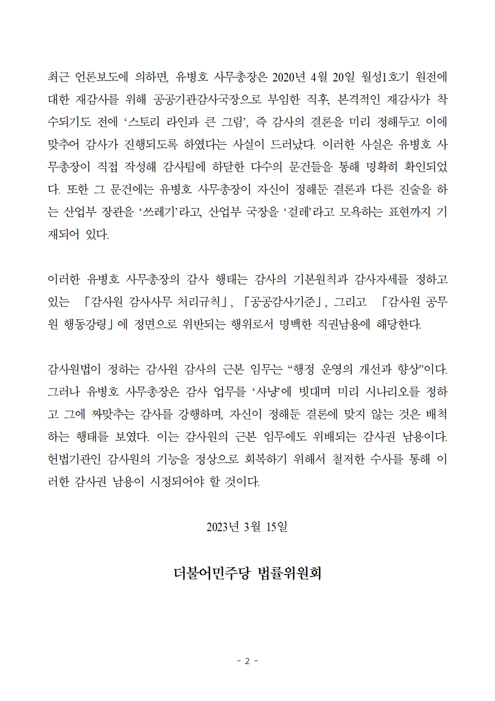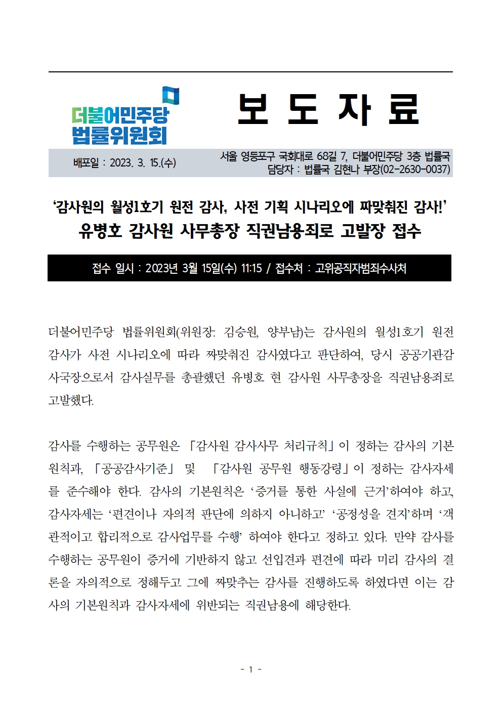 230315_보도자료_유병호_월성1호기_원전_감사_직권남용_고발.pdf