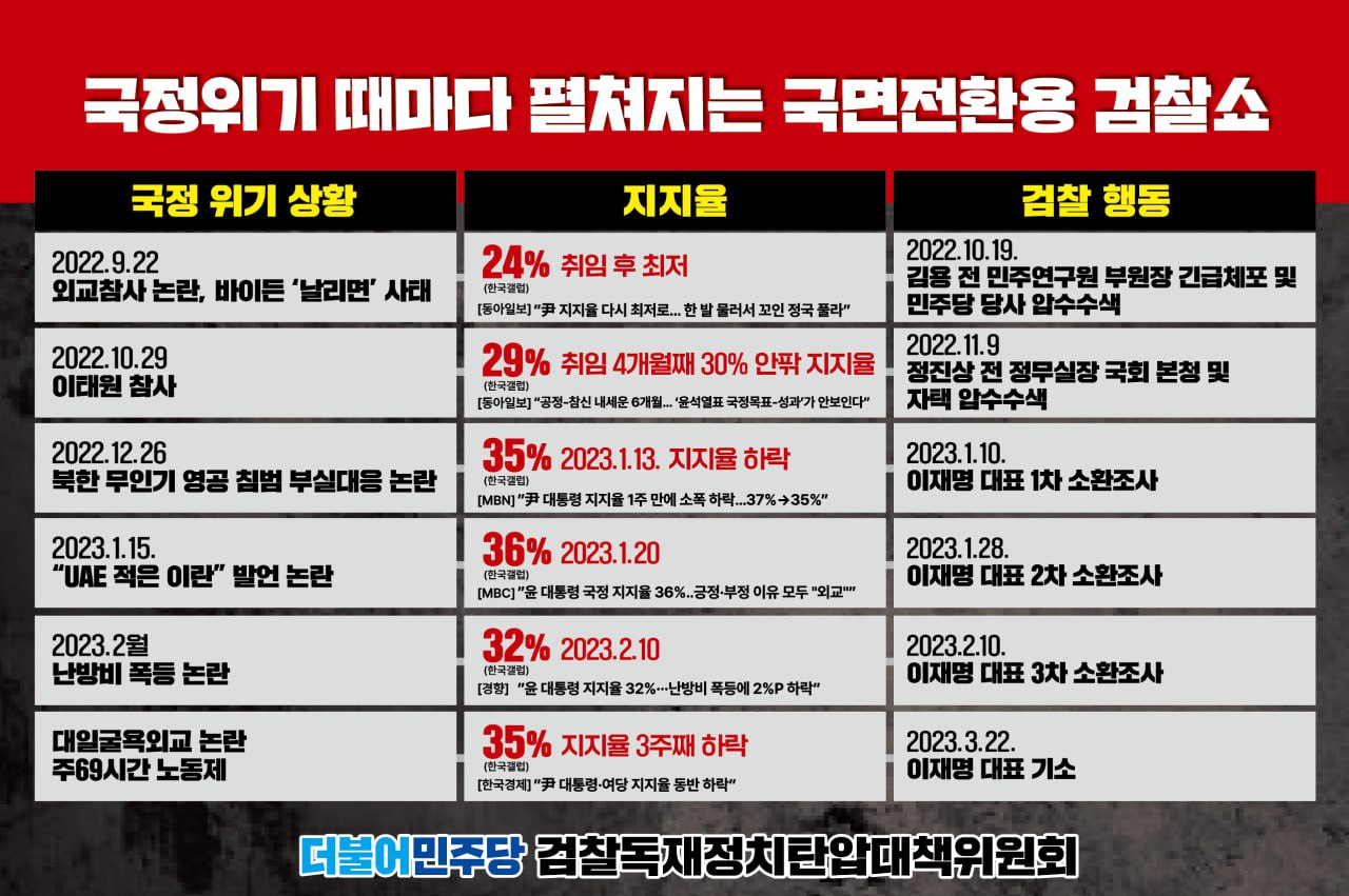 [입장문] 더불어민주당 검찰독재정치탄압대책위원회, 지지율 떨어질 때마다 반복되는 ‘국면전환’ 쇼, 이러니 ‘정치검찰’ 소리 듣는 것입니다