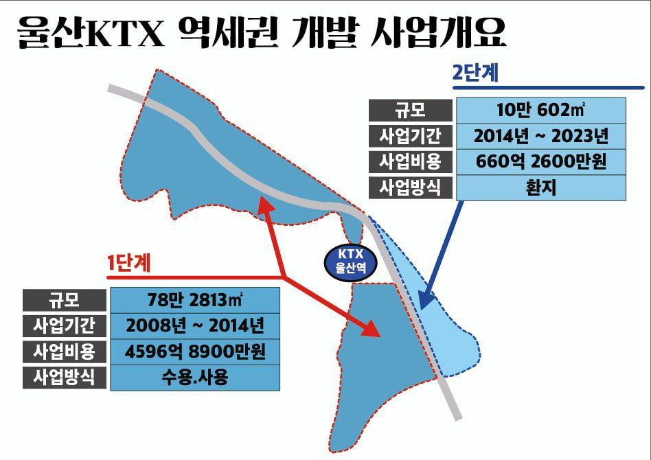 울산시는 KTX 역세권을 개발사업을 2단계로 나눠, 1단계는 사업기간 2008년부터 2014년으로, 2단계는 2014년부터 2023년으로 도시개발사업을 진행했습니다.