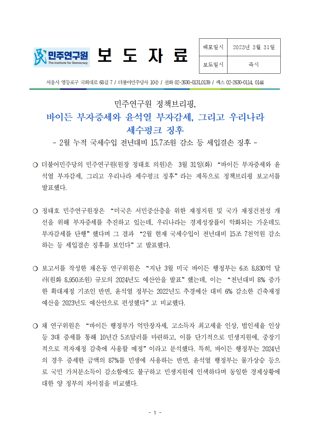 민주연구원_보도자료_바이든_부자증세와_윤석열_부자감세,_그리고_우리나라_세수펑크_징후.pdf