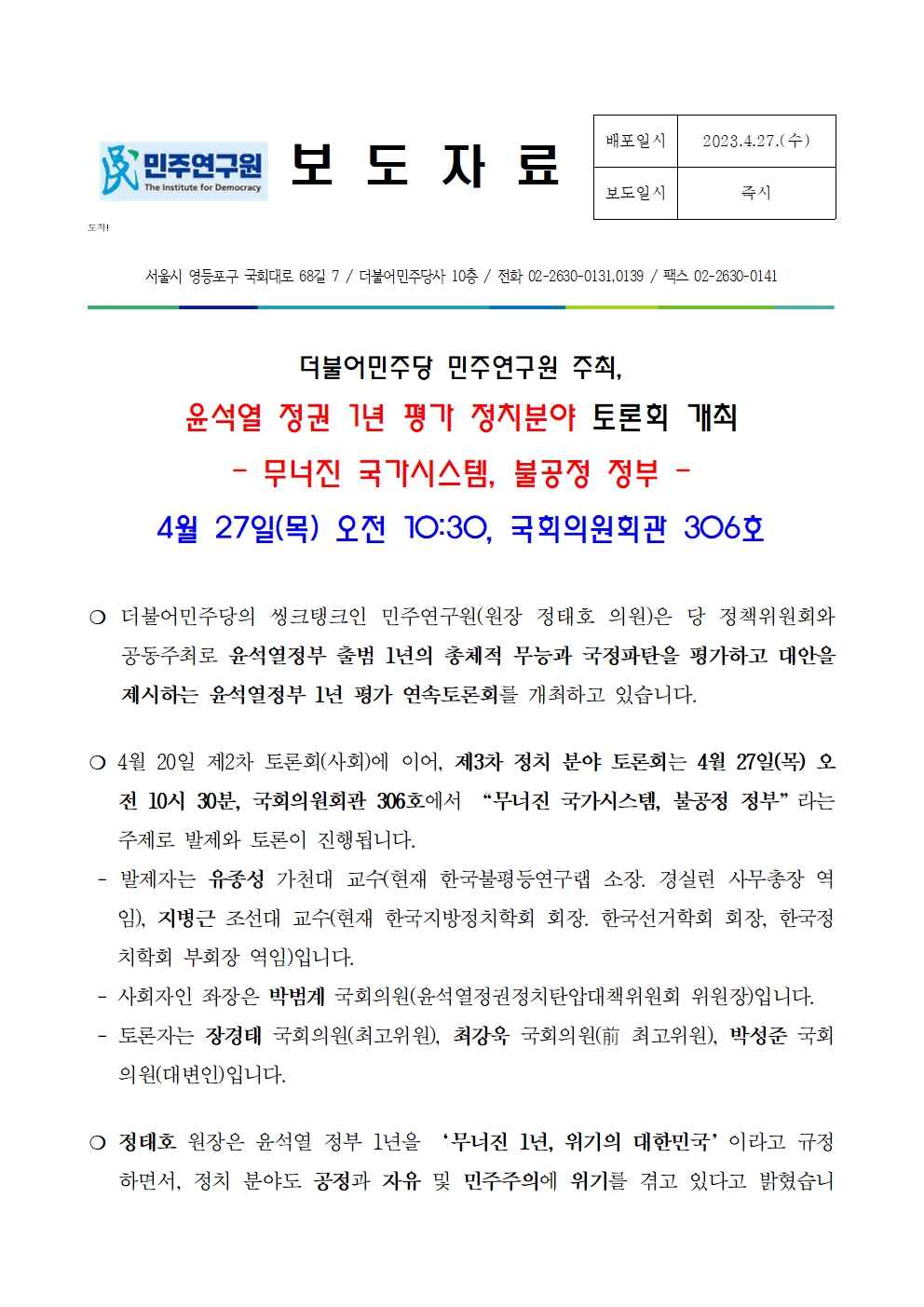 230427_보도자료_민주연구원,_윤석열_정권_1년_평가_정치분야_토론회.pdf