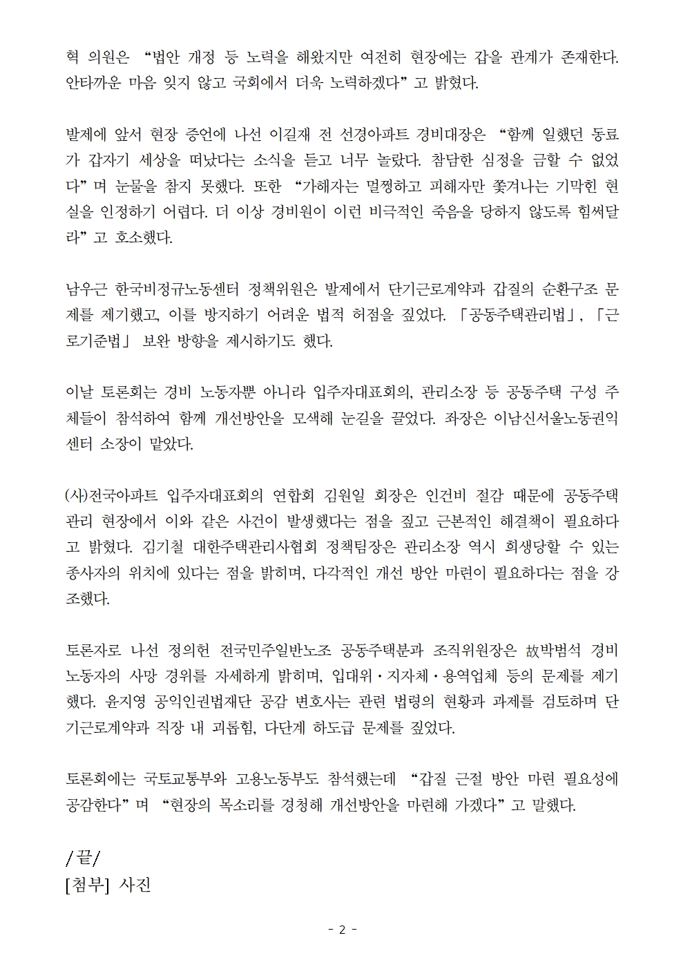 [보도자료] 더불어민주당 을지로위원회, '故최희석 경비 노동자 3주기, 공동주택 종사자 갑질 근절 개선방안 국회토론회 개최'
