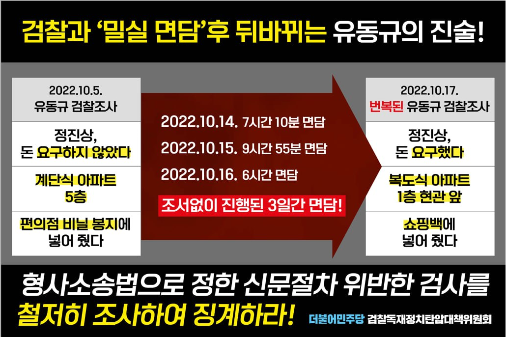 [입장문] 더불어민주당 검찰독재정치탄압대책위원회, 검찰과 ‘밀실 면담’하면 뒤바뀌는 유동규의 진술, 검찰은 유동규 기억상실 치료사입니까?