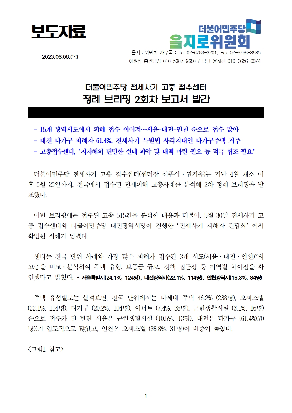 [보도자료] 더불어민주당 을지키는민생실천위원회ㆍ전세사기 피해고충 온라인접수센터, 정례 브리핑 2회차 보고서 발간