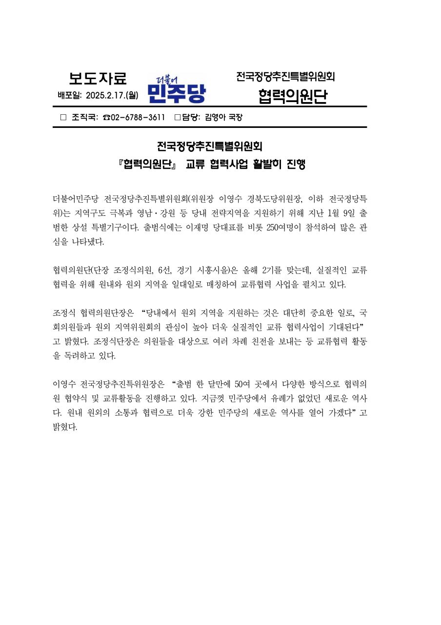 더불어민주당 전국정당추진특별위원회, 『협력의원단』 교류 협력사업 활발히 진행