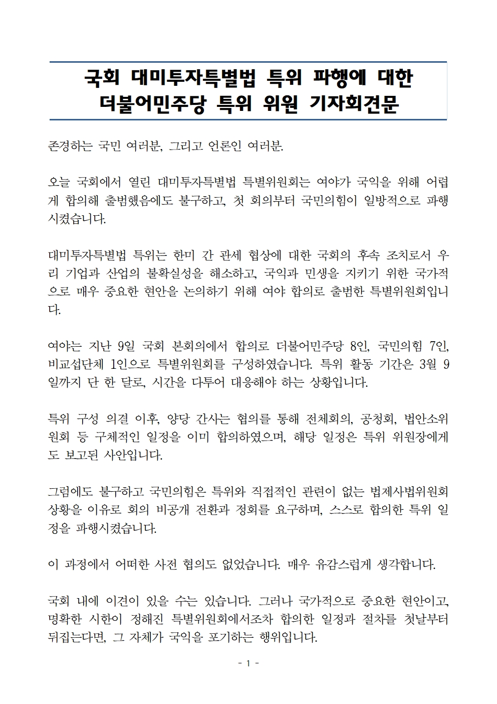 더불어민주당 대미투자특별법 특별위원회, 국회 대미투자특별법 특위 파행 관련 기자회견문