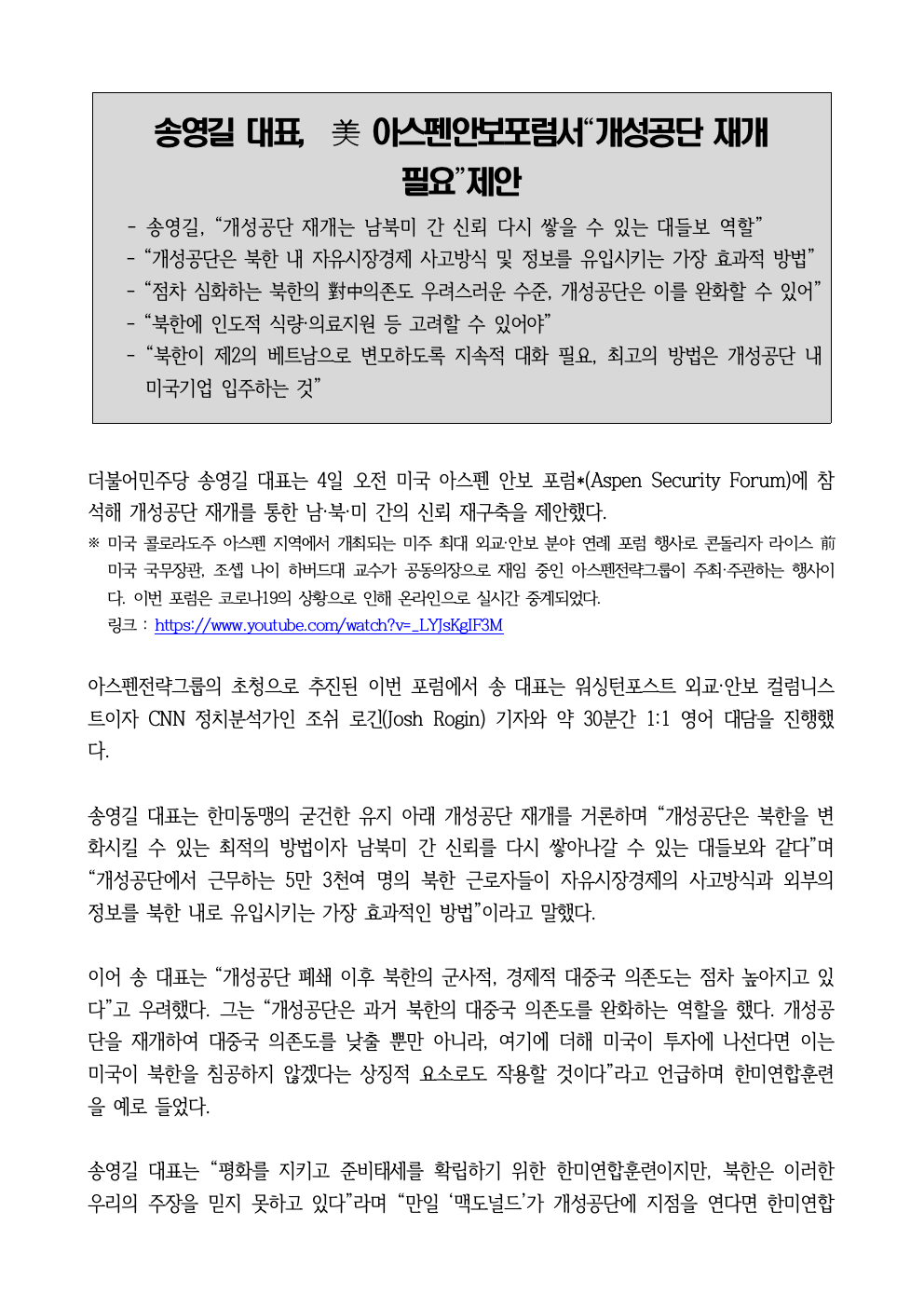 [보도자료] 송영길 당대표, 아스펜 포럼 대담 및 질의응답