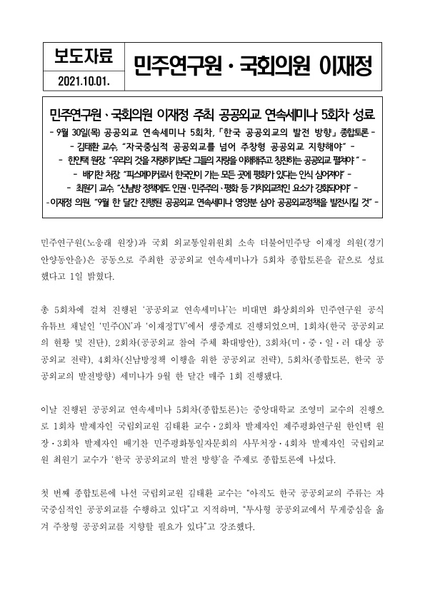 211001_민주연구원국회의원이재정보도자료_공공외교연속세미나_5회차_성료.hwp