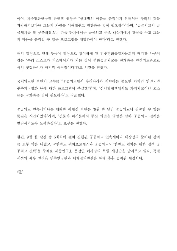 [보도자료] 민주연구원ㆍ국회의원 이재정 주최 공공외교 연속세미나 5회차 성료