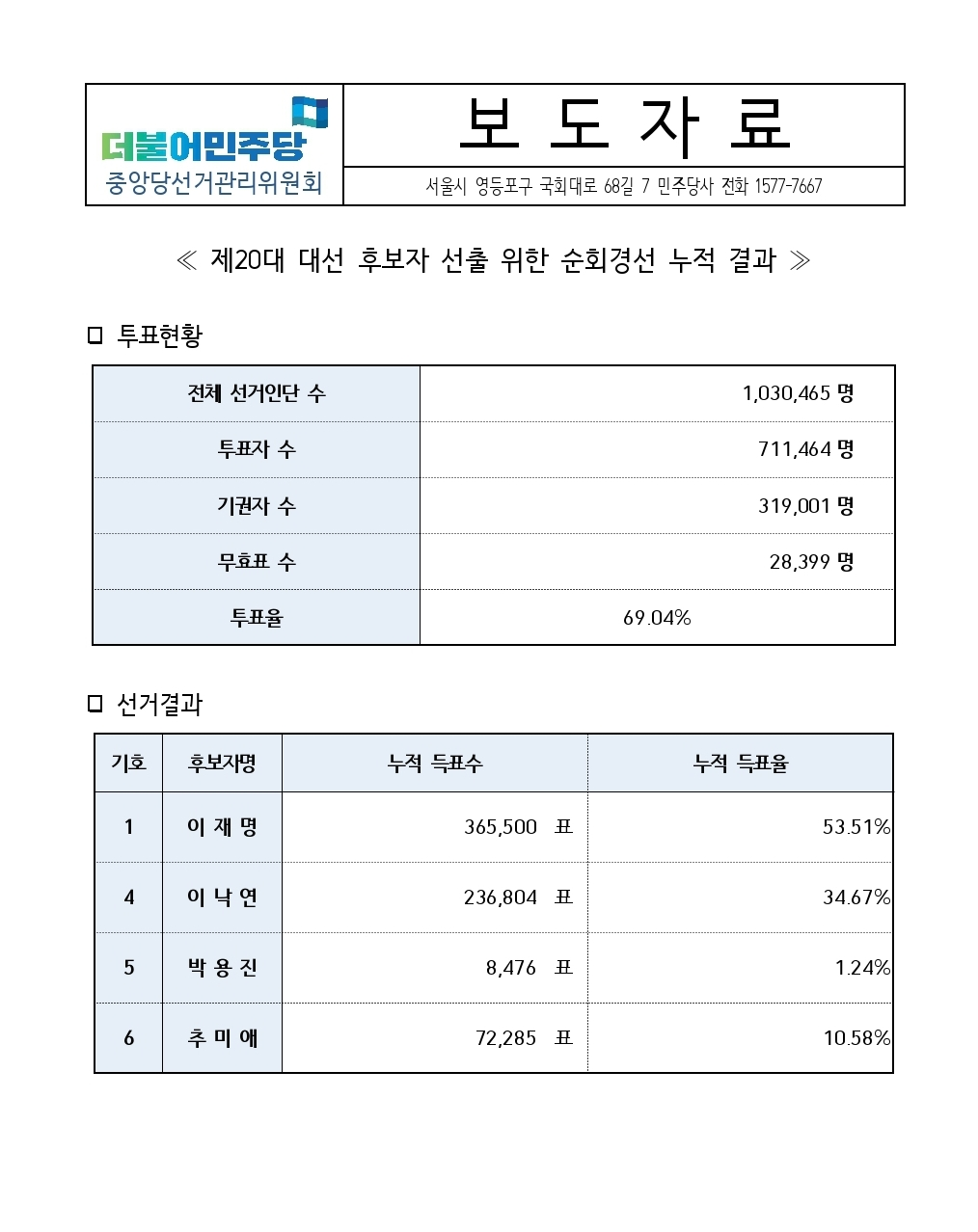 [보도자료] 인천 제20대 대선 후보자 선출을 위한 순회경선 결과