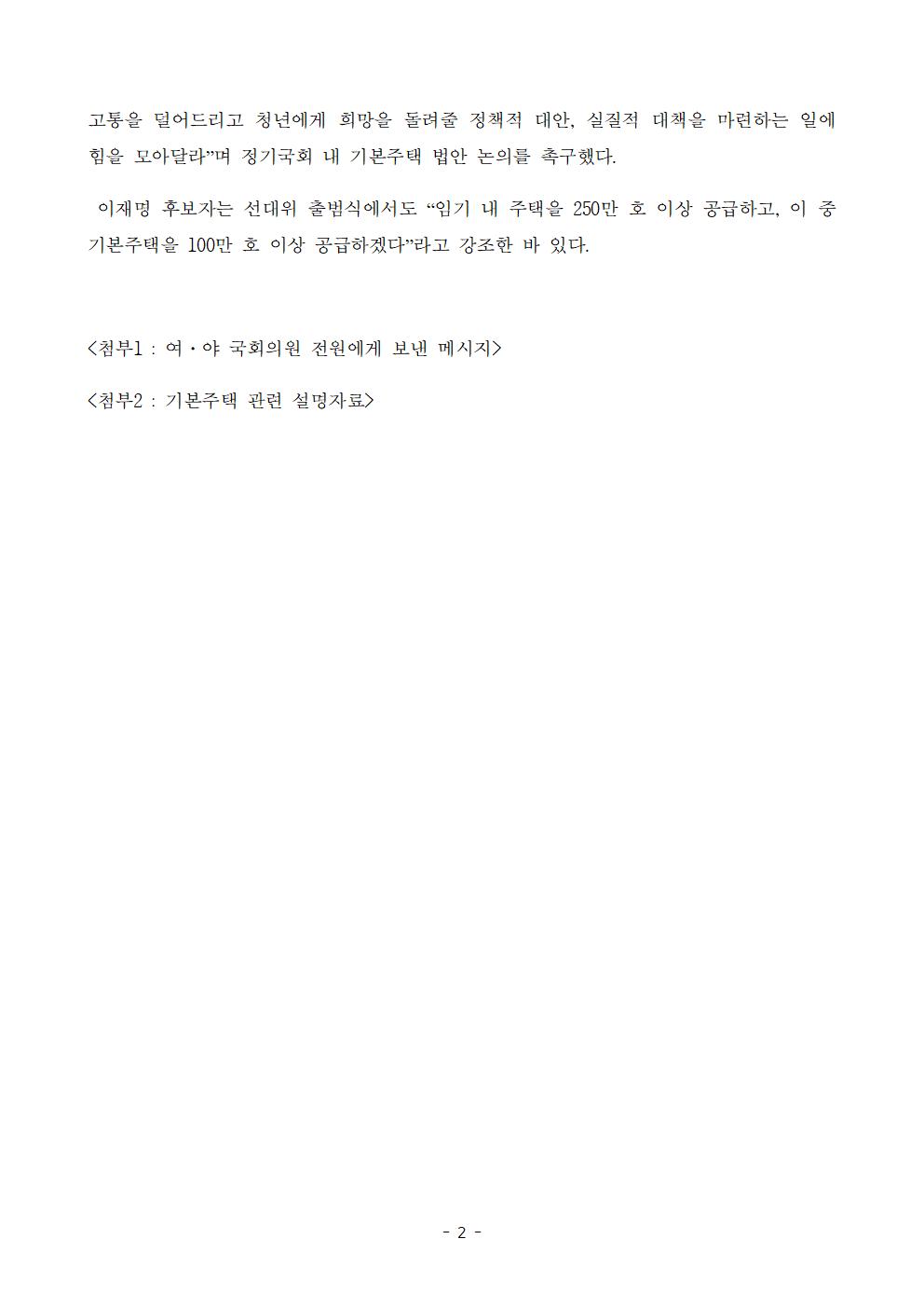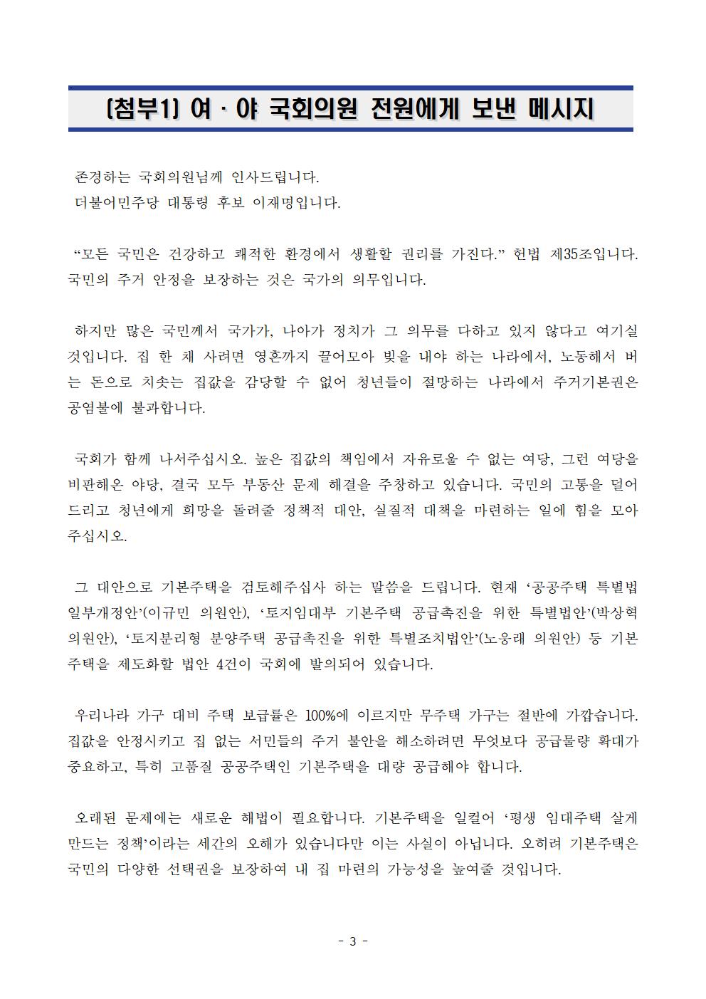 [보도자료] 더불어민주당 대전환 선대위, 이재명 후보자, 여·야 국회의원 전원에게 기본주택 입법 논의 제안