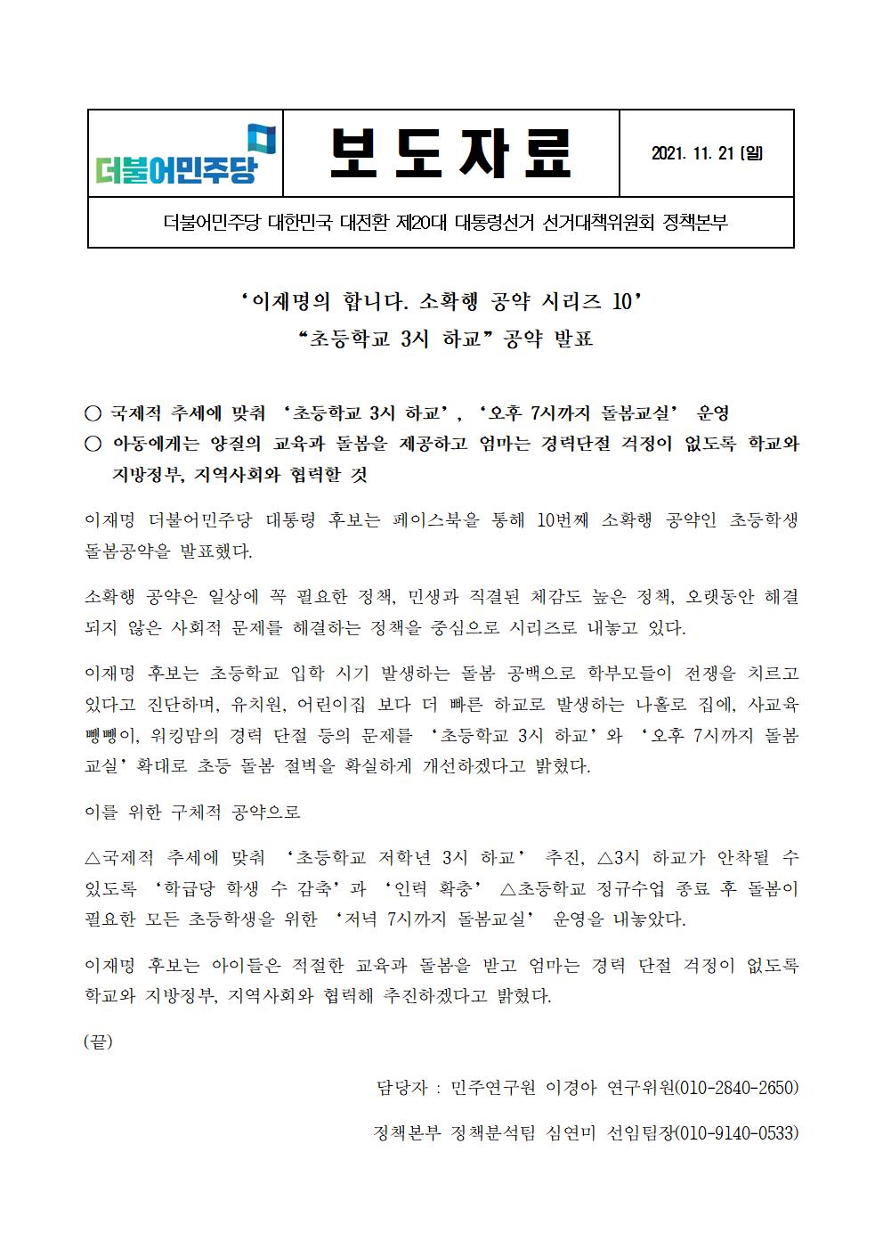 [보도자료] 더불어민주당 대전환 선대위 정책본부, '이재명의 합니다. 소확행 공약 시리즈 10' "초등학교 3시 하교" 공약 발표