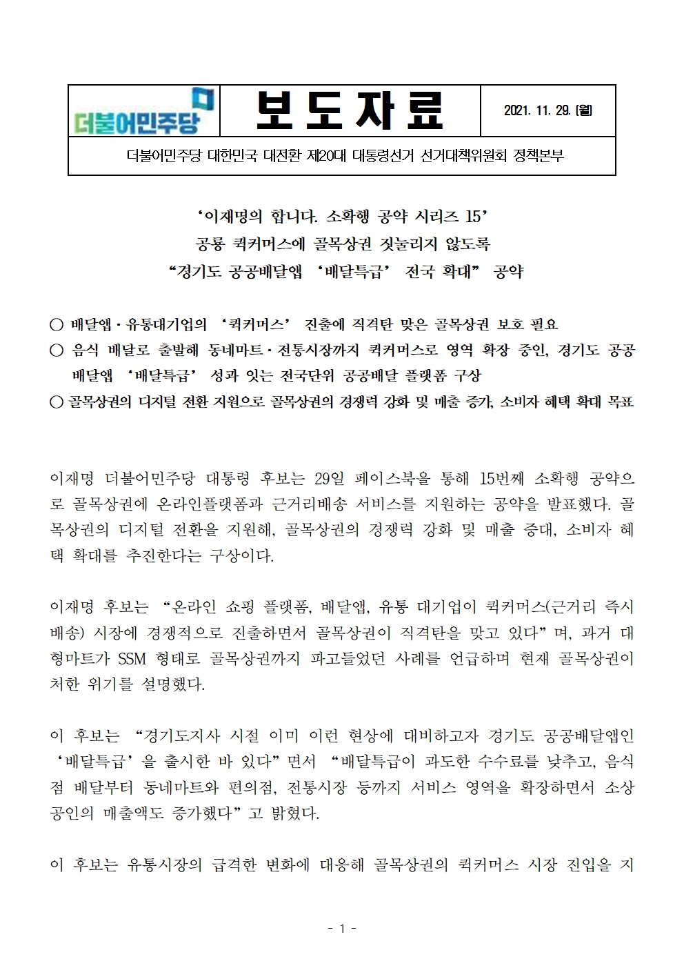 [보도자료] 더불어민주당 선대위 정책본부, '이재명의 합니다. 소확행 공약 시리즈 15' 동네슈퍼 퀵커머스 구축