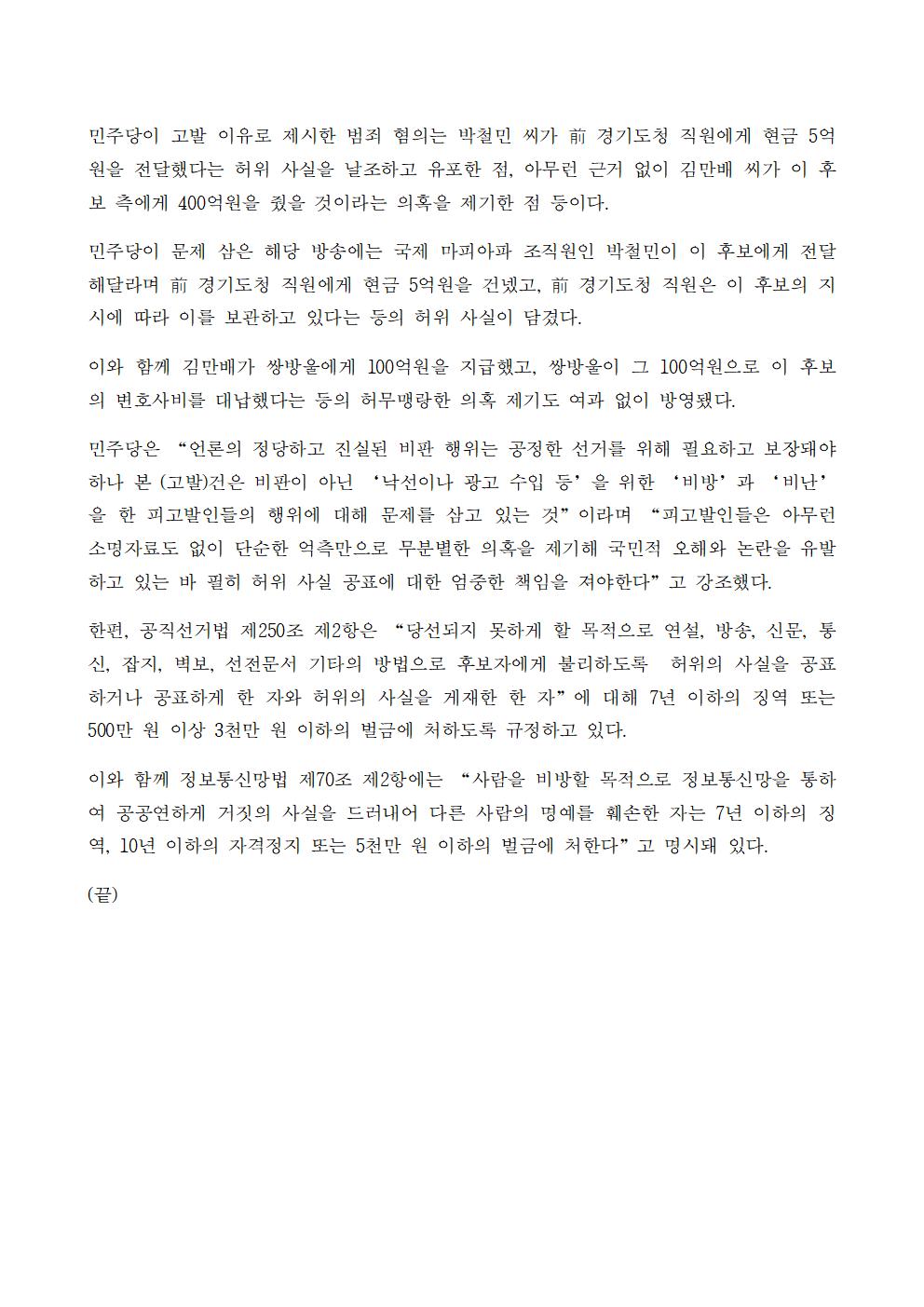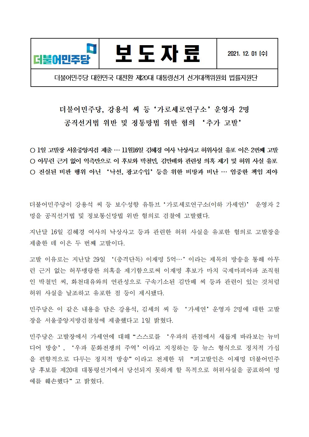 [보도자료] 더불어민주당 선대위 법률지원단 가로세로연구소 운영자 2명 공직선거법 위반 및 정통망법 위반 혐의 추가고발