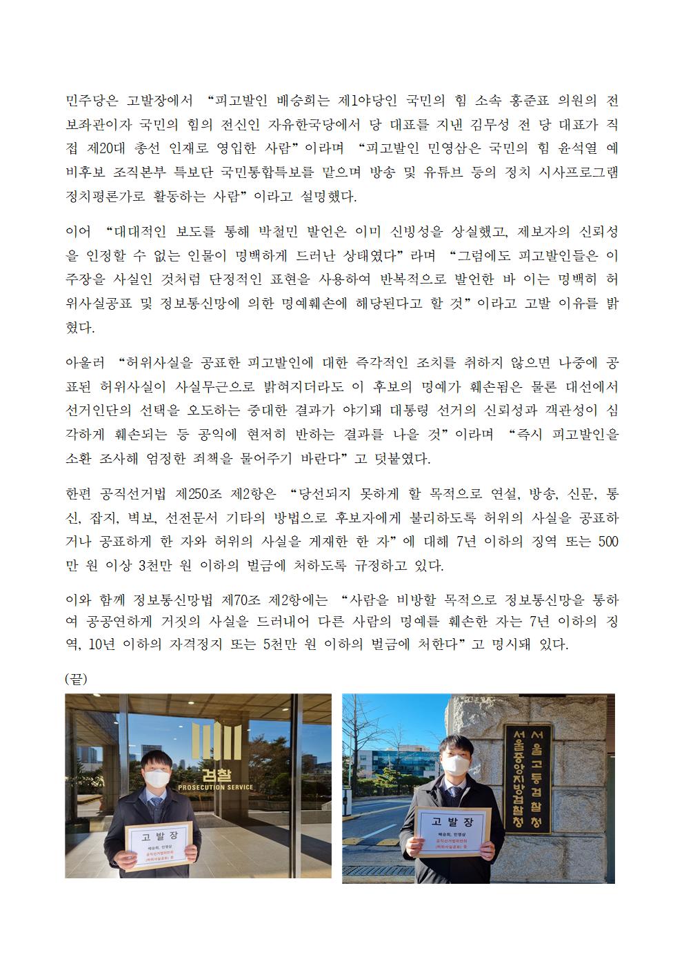 [보도자료] 더불어민주당 선거대책위원회 법률지원단 배승희 변호사 민영삼 정치평론가 검찰 고발