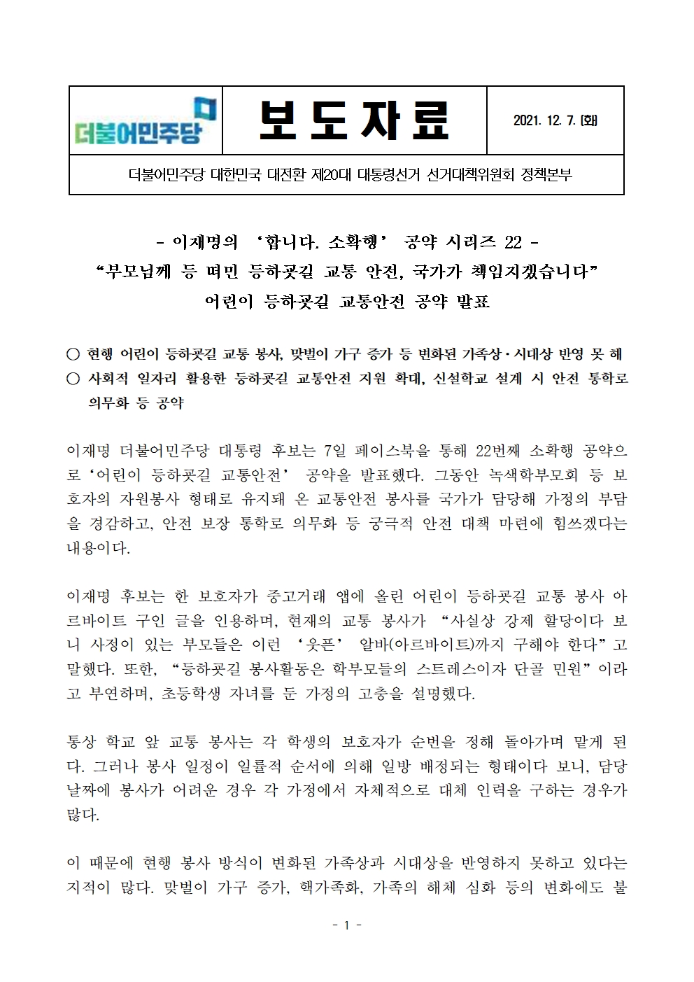 [보도자료] 더불어민주당 선대위 정책본부, '이재명의 합니다. 소확행 공약 시리즈 22' 어린이 등하굣길 교통안전 공약