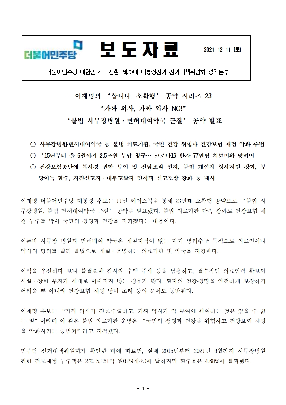 [보도자료] 더불어민주당 선대위 정책본부, '이재명의 합니다. 소확행 공약 시리즈 23' 불법 사무장병원 · 면허대역약국 근절 공약