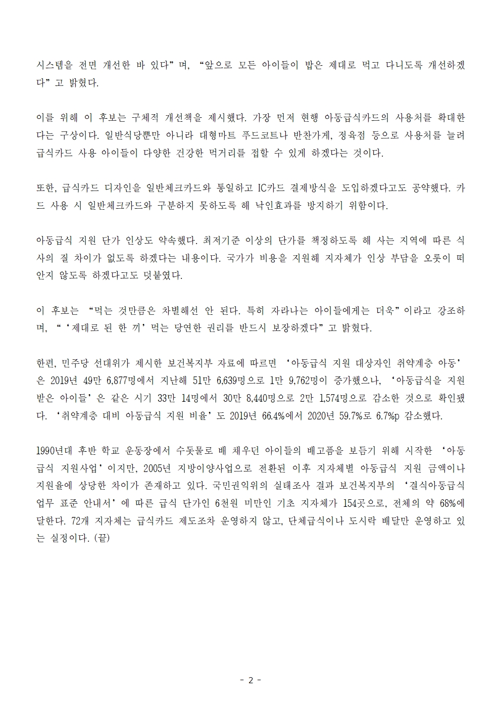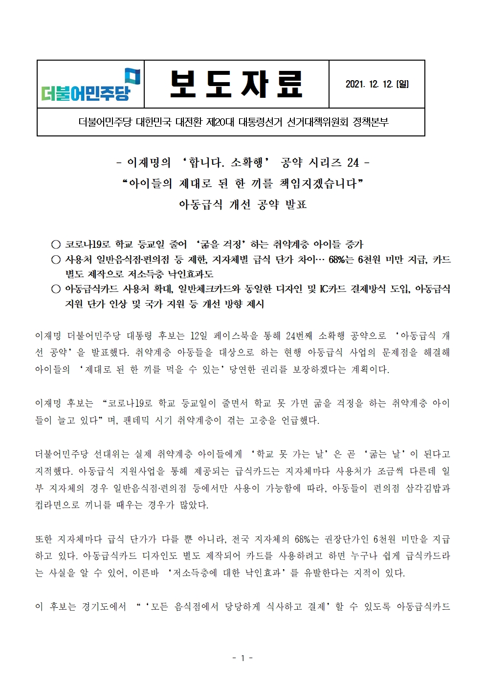 [보도자료] 더불어민주당 선대위 정책본부, '이재명의 합니다. 소확행 공약 시리즈 24' 아동급식 개선 공약