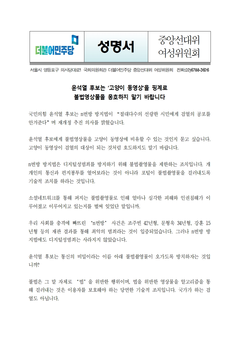 [성명서] 더불어민주당 중앙선대위 여성위원회, 윤석열 후보는 '고양이 동영상'을 핑계로 불법영상물을 옹호하지 말기 바랍니다
