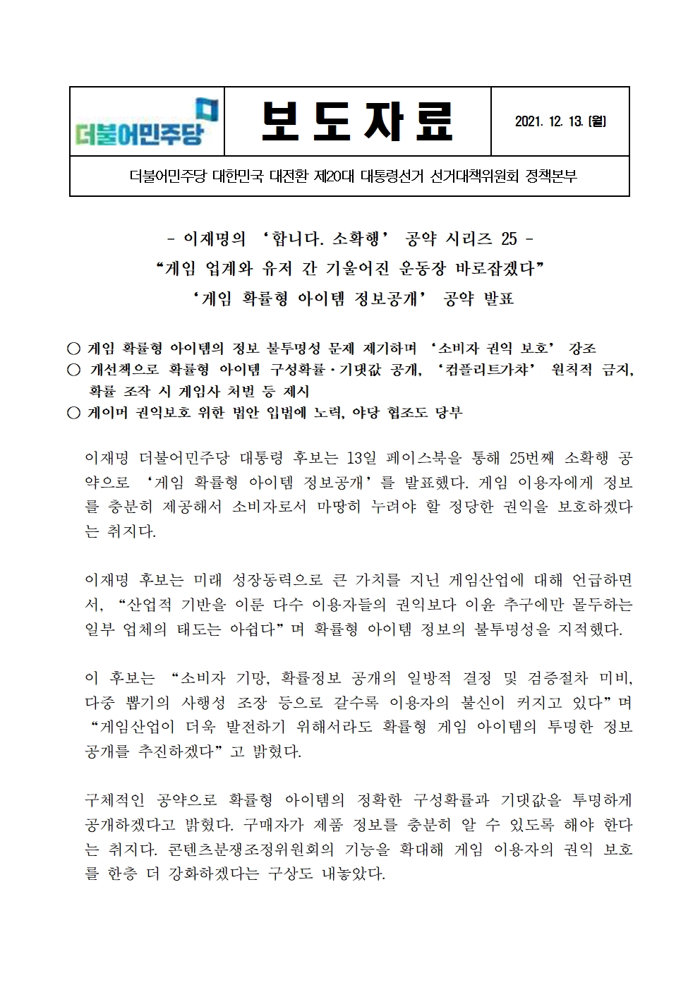[보도자료] 더불어민주당 선대위 정책본부, '이재명의 합니다. 소확행 공약 시리즈 25' 게임 확률형 아이템 정보공개 공약